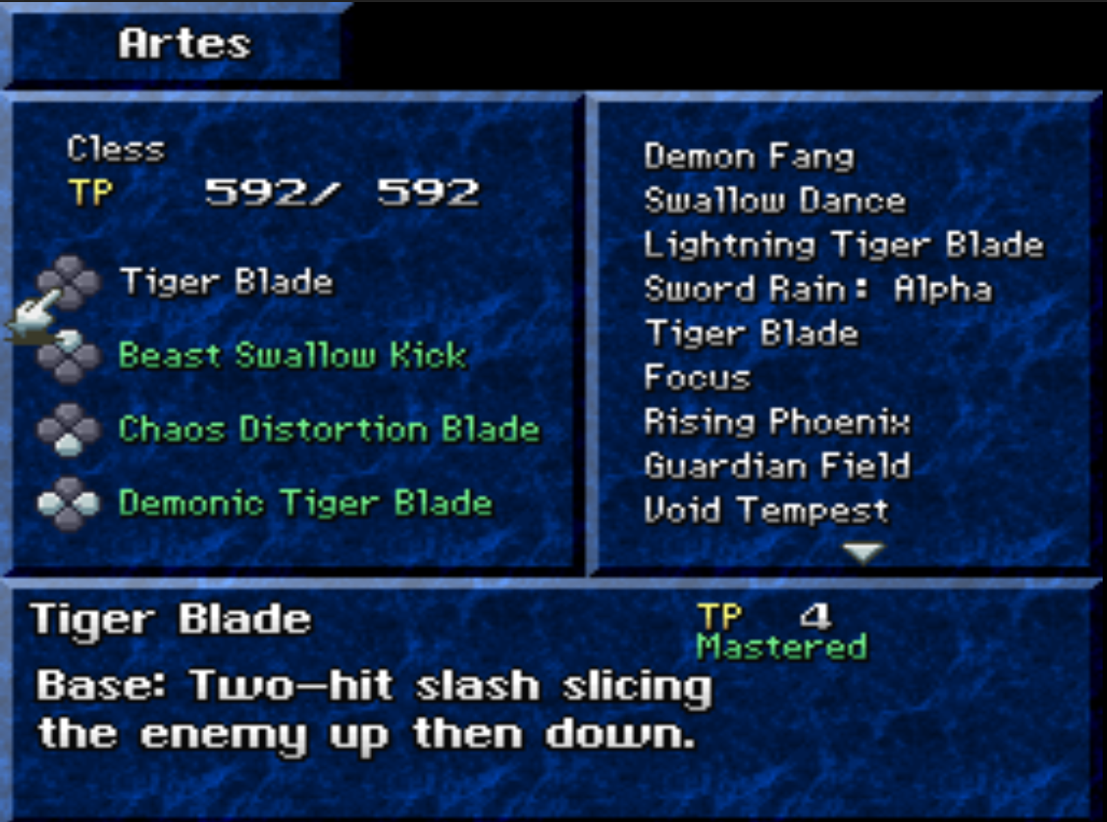 Cless en particular es el personaje con mas ataques en el juego con sus Artes basicos y sus Arcane Artes que son dos Artes basicos combinados que se aprenden al encontras o comprar libros de Arcane Artes, lo cual lo hace el personaje mas flexible del juego contando con Artes de ataque, Artes de soporte propio y un Arte de curación. Cada Arte y Arcane Arte se puede poner en un atajo en un botón direccional que se pueden activar en batalla apretando dicho botón direccional más el boton del Arte.