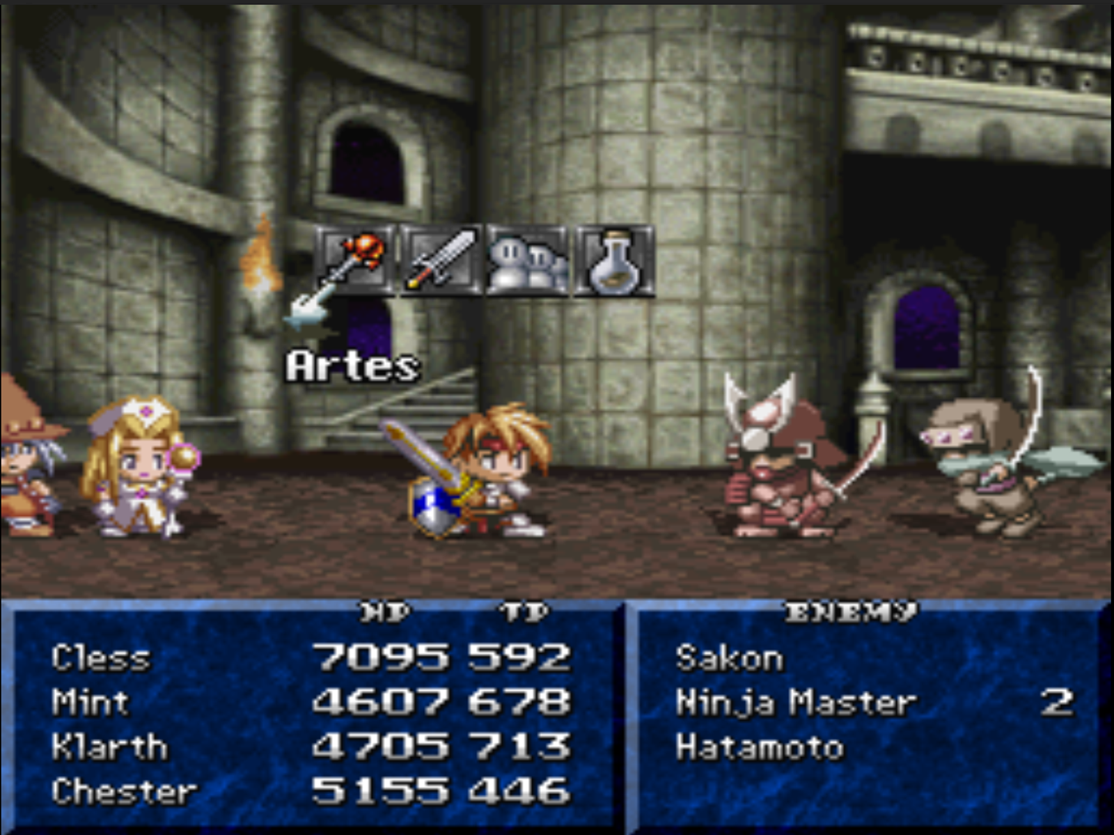 Mint es la típica Healer que tiene pura magia de curación y de soporte, Klarth es un Summoner que todos sus summons son de ataque, Arche es la maga con un listado grande de magia que puede utilizar, Chester es un arquero lo cual suena simplón pero termina siendo una buena unidad por los efectos que traen sus Artes, y por ultimo Suzu Fujibayashi que es como otra Cless pero con menos de la mitad de Artes disponibles que este.