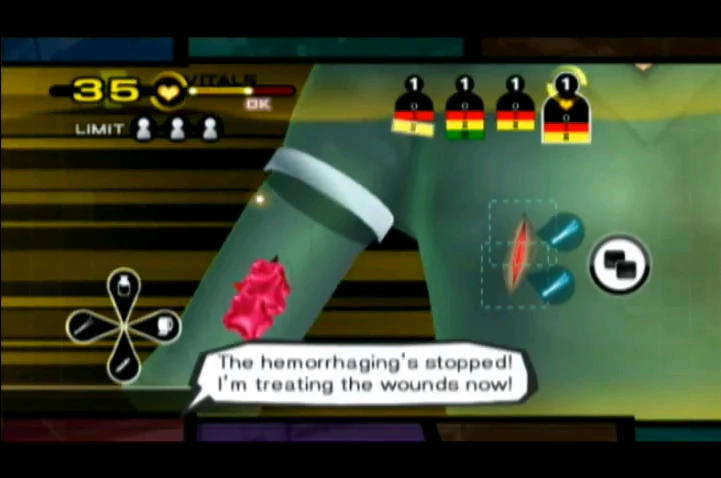 El gameplay de cirugía es simple, guiás el cursor del WiiMote por la pantalla para hacer los trabajos necesarios como incisiones, suturas, inyecciones, etc. y con el stick del Nunchuk se selecciona la herramienta que se precise.