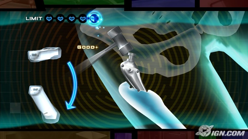 Por ejemplo como se ve arriba, con el WiiMote se controla el bisturí y hay que seguirla linea azul para remover el tumor sin salirse de la linea puntada, mientras mas preciso el movimiento mas puntaje uno obtiene, pero el juego te permite detenerte para descansar un rato y seguir, claro eso te reinicia el contador de puntaje.