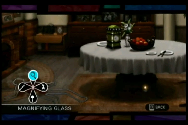 En ambos casos, como se ve en la imagen, podes investigar el cuerpo de la victima libremente con el stick del Nunchuk y hacer zoom con A del WiiMote para ver zonas que te llaman la atención. Si se encuentra algo notorio esto se agrega a la lista de evidencias para luego ver en la oficina de Naomi.