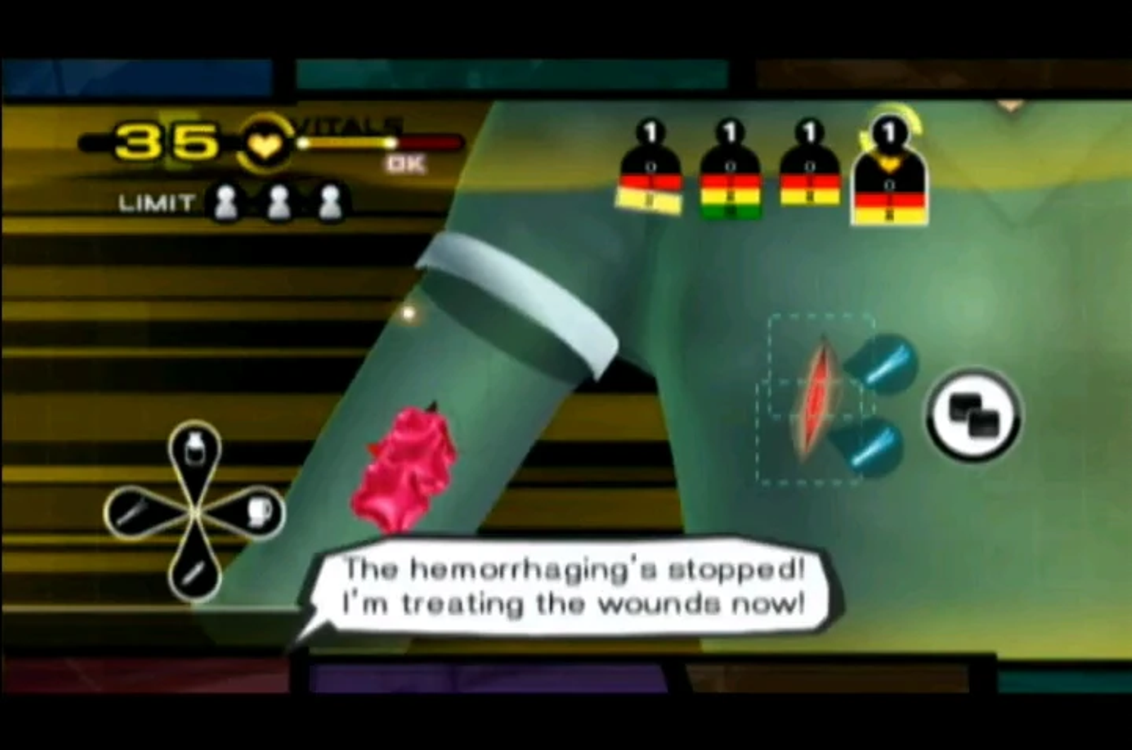 El gameplay de cirugía es simple, guiás el cursor del WiiMote por la pantalla para hacer los trabajos necesarios como incisiones, suturas, inyecciones, etc. y con el stick del Nunchuk se selecciona la herramienta que se precise.