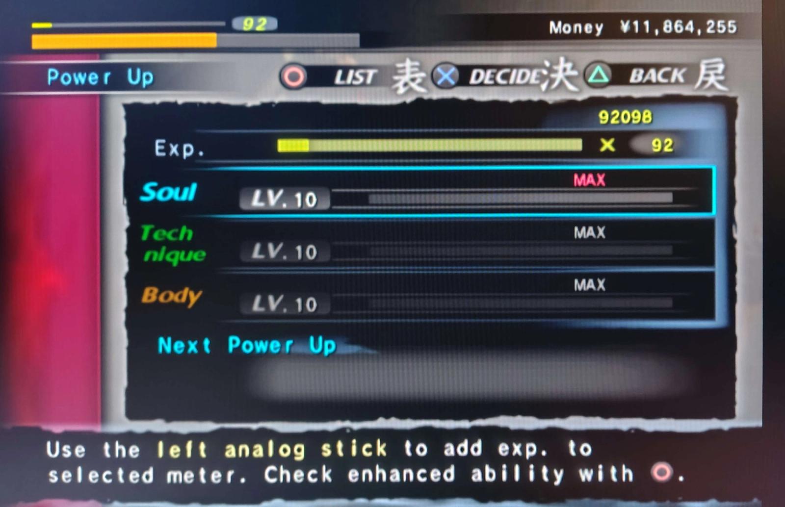 Ganás puntos de experiencia peleando y realizando misiones, y los gastás en habilidades divididas en tres categorías: Soul, Technique y Body.