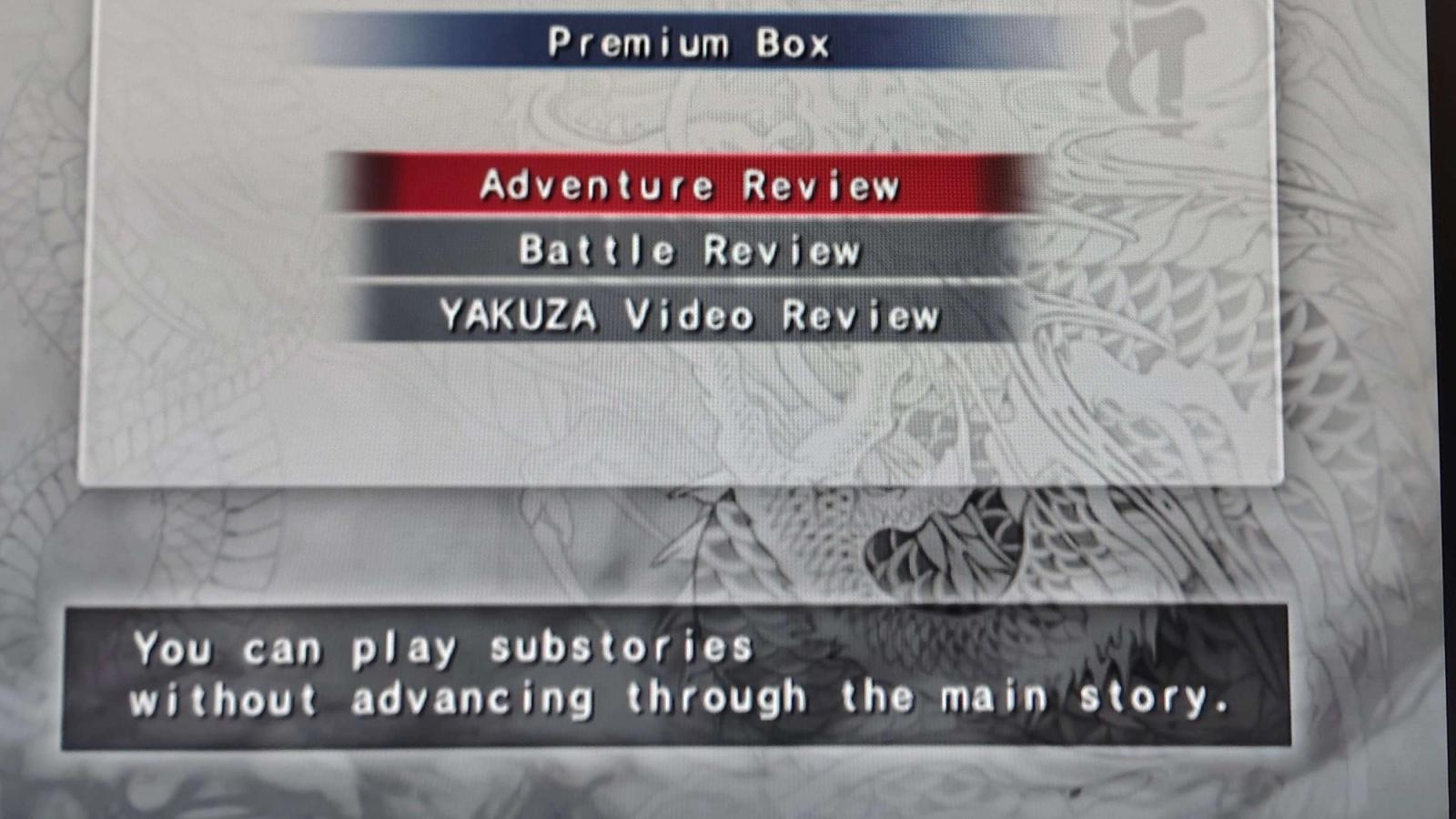 Finalmente en cuanto a contenido, al finalizar la historia se desbloquea en el menú principal la opción Premium Box. En ella aparecen Adventure Review que, en lugar de funcionar como un New Game + tradicional, te coloca en Kamurocho sin historia ni objetivos a seguir, ni habilidades ni ítems. Sirve solo para hacer contenido secundario. Battle Review te da una lista larga de desafíos y retos calificados por rangos con escenarios y reglas distintas. Video Review es una recolección ordenada de todas las cinemáticas del juego.